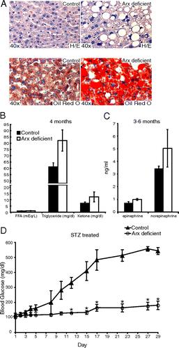 ① Aidan S. Honcockらは、通常マウス(control)とα-cell transcription factor欠損マウス(Arx)の二群に 糖尿病マウスを作製する際によく用いられる薬剤streptozotocin(STZ)を投与して、血糖値の変化を見た。Control群は徐々に血糖値が上昇してくるが、Arx群では血糖値の上昇がみられなかった。このことは、グルカゴンが存在しないときには、インスリンの欠乏のみで血糖値の上昇が来ないことを示唆しているといえる。
