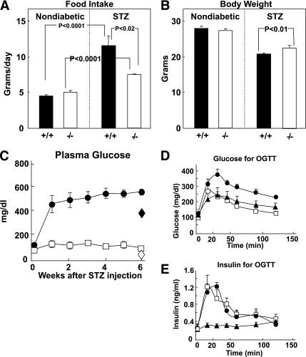 A: Comparison of food intake in nondiabetic and STZ-treated Gcgr+/+ (■) and Gcgr−/− (□) mice (n = 6). B: Comparison of body weight in Gcgr+/+ (■) and Gcgr−/− (□) before and after STZ induction of β-cell destruction. C: Comparisons of weekly nonfasting glucose levels in Gcgr+/+ (●) and Gcgr−/− (□) after STZ-induced β-cell destruction, and overnight fasting glucose levels for Gcgr+/+ (♦) and Gcgr−/− (◇) at the end of the study (n = 6). D: Glucose values for oral glucose tolerance test (OGTT) (2 g/kg) performed after a 16-h fast in normal Gcgr+/+ (●), Gcgr−/− (☐), and STZ-treated Gcgr−/− (▲) mice (n = 4). E: Insulin levels for OGTT in normal Gcgr+/+ (●), Gcgr−/− (☐), and STZ-treated Gcgr−/− (▲) mice (n = 4).