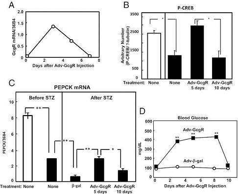 肝細胞において、グルカゴンは、グルカゴン受容体を刺激してATPをcAMPに変換し、このcAMPがPKA介して、肝臓における糖新生を促進している。