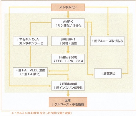 10年ほど前に、メトホルミンの血糖降下作用は、ATP活性化プロテインキナーゼ(AMPK)を活性化して肝臓の糖放出の抑制と筋肉のグルコース取り込みの更新による機序が示された。