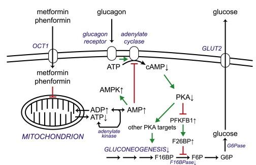 しかし、2010年にAMPKやその上流のLKB1の欠損した肝臓や肝細胞でもメトホルミンの血糖降下作用が認められるので、それ以外の作用が存在することが想定されていた。