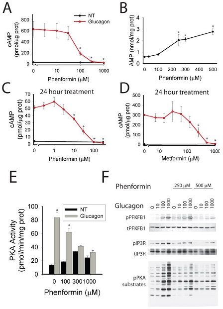 A. Primary hepatocytes were incubated with the indicated phenformin concentrations for 2 hours, 5 nM glucagon for 15 minutes, lysed, and assayed for total cellular cAMP and protein. N=4 for each point. B. Primary hepatocytes incubated with the indicated concentration of phenformin for 2 hours were extracted with perchloric acid and cellular nucleotides quantified by HPLC. N=4 for each point. C-D. Primary hepatocytes were incubated with the indicated concentration of phenformin (C) or metformin (D) for 24 hours, treated with 5 nM glucagon, lysed, and assayed for total cellular cAMP. N=4 for each point. E. Primary hepatocytes were incubated with the indicated concentrations of phenformin for 2 hours, treated with 5 nM glucagon, lysed, and PKA kinase activity determined. N=6 for 0 and 1000 μM phenformin groups, N=4 for 100 and 300 μM phenformin groups. F. Primary hepatocytes were incubated with phenformin for 2 hours, then glucagon, and protein was analyzed by western blot with the phospho-PKA substrate motif antibody, total and phospho-PFKFB1 antibodies, and total and phospho IP3R antibodies. Error bars represent standard error.