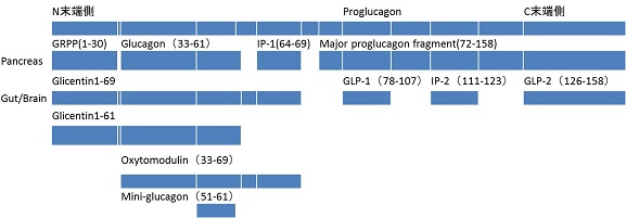 グルカゴンはプログルカゴンからプロセッシングを受けて小さくなるが、様々な切れた田があり、それによりいろいろな物質が産出され、複数のものを、グルカゴンとして測定していたため、正確な測定が困難であった。
