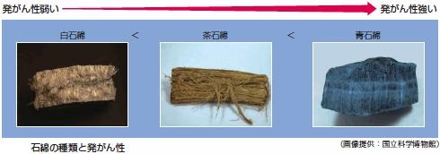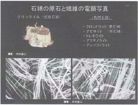 石綿:アスベストは蛇紋石族のクリソタイル(白石綿)と角閃石族の吹付石綿として使われていたクロシドライト(青石綿)とアモサイト(茶石綿)および他の石綿の不純物として含まれるアンソフィライト石綿、トレモライト石綿、アクチノライト石綿に分けられる。