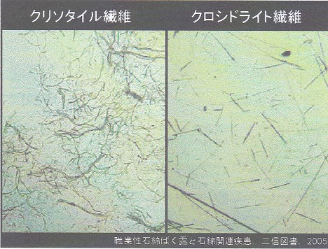 繊維を拡大してみてみると、クリソタイル繊維は柔らかくたわんでいるが、クロシドライト繊維は直線状で細い。