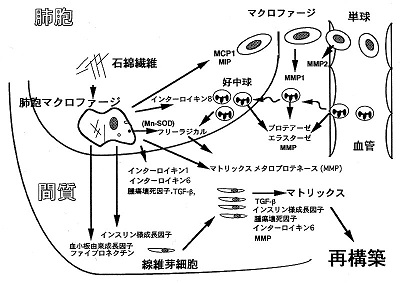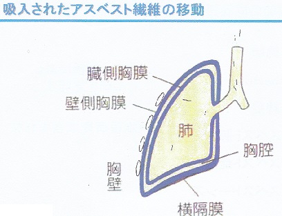 吸入されたアスベスト繊維は気管から細気管支を経て肺胞に到達し、臓側胸膜を通過して壁側胸膜へと移動していく。