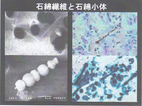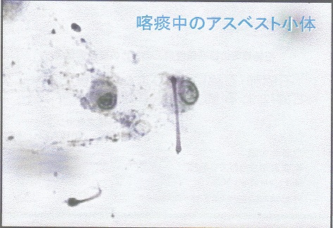 アスベストに鉄蛋白が付着し、20~30μm大の串刺し団子のようなアスベスト小体となり無害化していると考えられている。