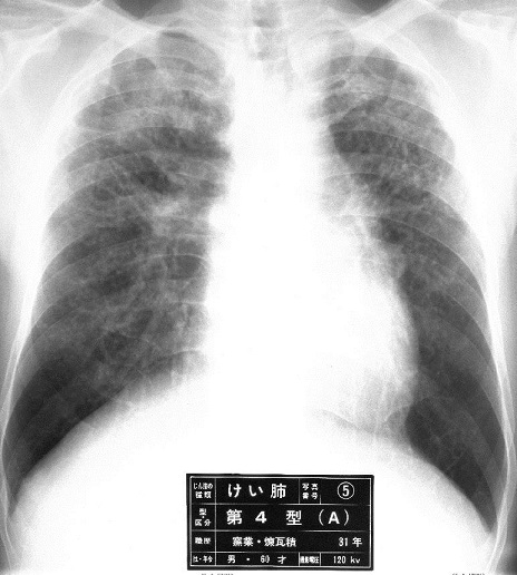 下肺野優位の不整型陰影を「じん肺標準エックス線写真」と比較して判定することになる。