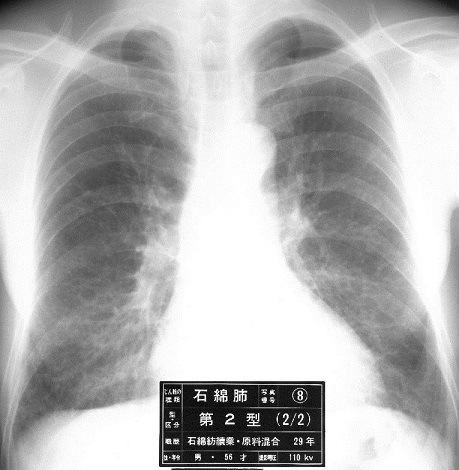 石綿肺Asbestosis:石綿粉じんを吸入することによって肺に生じた線維増殖性変化を主体とする疾病=石綿粉じんによる肺線維症+気道の慢性炎症