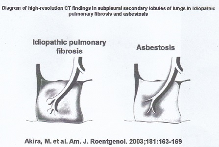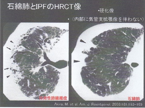 鑑別すべき疾患である特発性肺線維症は、上記理由から線維化により細気管支が拡張している像がみられることが多く、石綿肺の場合にはこの所見がないことが判断材料の一つになる。しかし、進行部分は他疾患との鑑別にあまり役立たない。