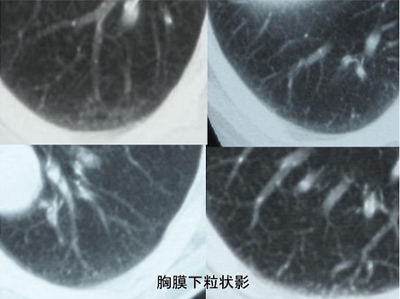 遊離圭酸によるじん肺である珪肺のレントゲン像は、上肺野優位の粒状影、大陰影が特徴的である。