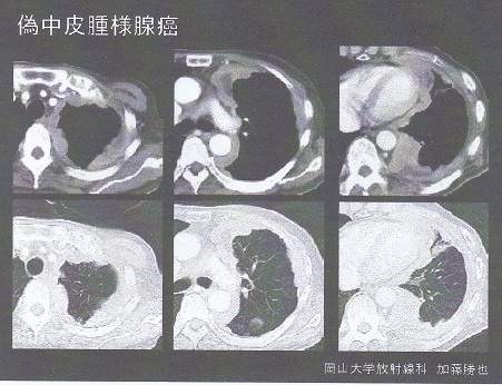 悪性胸膜中皮腫は縦隔側の胸膜肥厚が出てくる点でびまん性胸膜肥厚と異なるので、びまん性胸膜肥厚患者の経過観察中で縦隔側の胸膜肥厚を認めた際には、悪性胸膜中皮腫の合併を考え、精査をする必要がある。