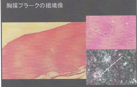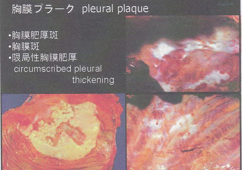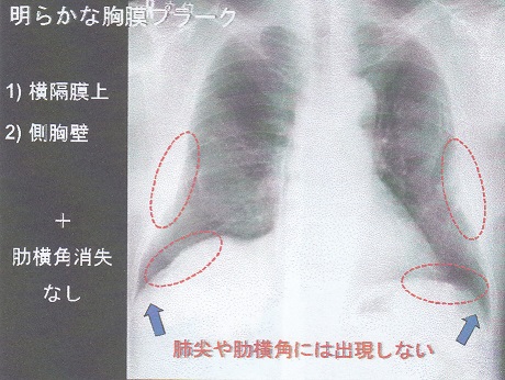 胸膜プラークのできやすい場所は横隔膜上、側胸壁、傍椎体、心外膜であり、逆にできにくい場所は肋横角部分と肺尖部である。