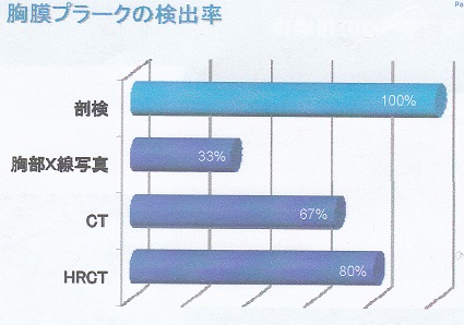 胸膜プラークの検出率は、単純レントゲンでは35%程度であること、CTも撮影条件によっては1/3程度描出できない点注意が必要である。