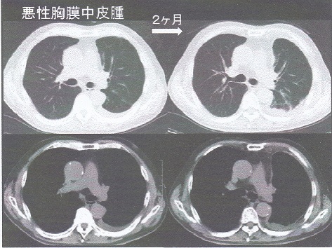 肺がんが出現するまでに30年程、臓側胸膜を通過し、壁側胸膜に移動するまでに約10年かかるため、胸膜中皮腫が出てくるまでに40年程の経過がかかると考えられている。