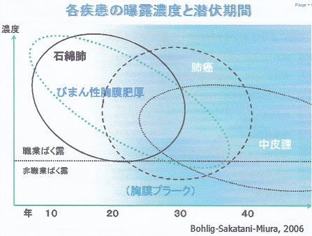 各疾患と石綿の暴露濃度と潜伏期間を図示すると下図のようになる。