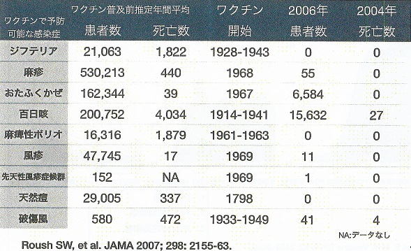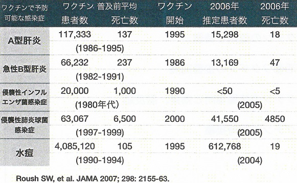 アメリカで1980年から2005年に認可・推奨されたワクチンが予防する感染症による罹患数、死亡数の比較を見てみると、侵襲性肺炎球菌感染症を除き、10分の1以下に減少している。
