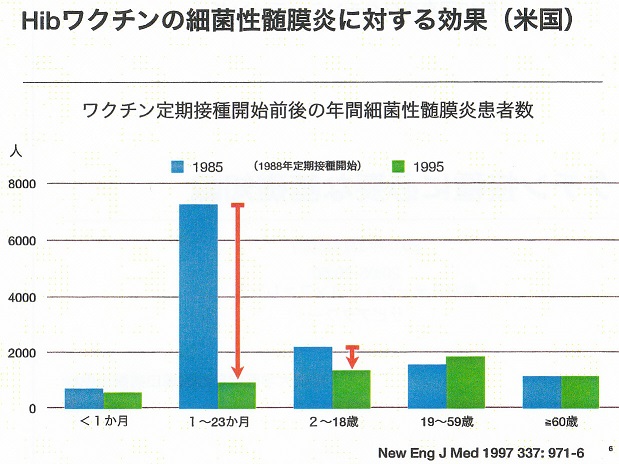 Hibワクチンが開始される前と後で、米国の細菌性髄膜炎患者数は、1~23ヵ月齢児で顕著に減少しており、2~18歳でも有意に減少しており、その多くがヘモフィルスインフルエンザ菌bによる髄膜炎の減少と考えられている。