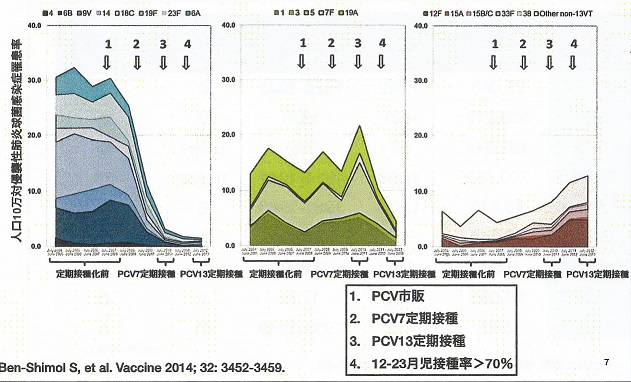 イスラエルの五歳未満小児の血清型別侵襲性肺炎球菌感染症の罹患率変化を見てみると、PCV7の定期接種化前に比べPCV7でカバーされる菌株(左の図)は顕著に減少し、PCV13に変更されても、変化は乏しい。