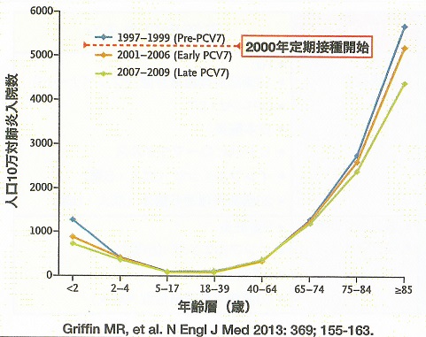 アメリカにおいて、PCV7定期接種導入前後の、年齢別平均肺炎入院率の変化を見てみると、定期接種開始以前の青い線からオレンジ、緑と年代が変化するにしたがって、2歳未満児の感染が減少しているばかりでなく、ワクチン接種をしていない75歳以上の高齢者、特に85歳以上の高齢者の肺炎入院率の低下が大きく、肺炎球菌ワクチン接種には、集団免疫効果があることが推察される。