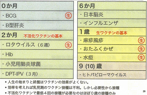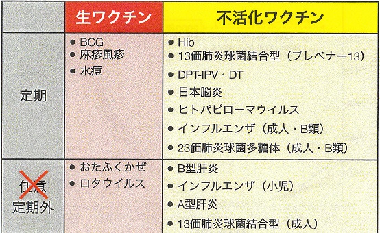 日本で使用されているワクチンで生ワクチンはBCG、麻疹・風疹、水痘、おたふくかぜ、ロタウイルスのみで、それ以外は不活化ワクチンである。