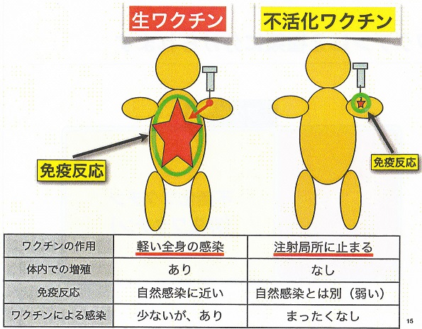 生ワクチンは体内で増殖し、軽い全身の感染症を起こすが、不活化ワクチンは注射局所に留まる。
