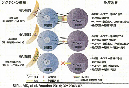 免疫応答は抗原の種類や量によって異なり、多価抗原は樹状細胞により多くの抗原が提示され、B細胞レセプター集積の増加が起こり、ヘルパーT細胞との共存時間が増加し、免疫効果の持続は長期となるが、破傷風トキソイドのように単価抗原の場合にはB細胞レセプターの集積がなく、ヘルパーT細胞との共存時間が短く、免疫効果の持続は中期~長期に留まる。
