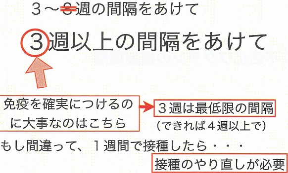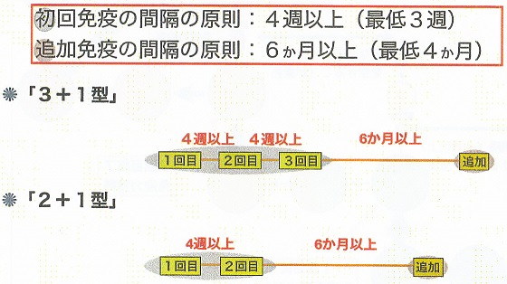 不活化ワクチンの場合には、複数回のワクチン接種が必要となるが、初回免疫と2回目の間隔は、免疫応答の強さを考えると4週間以上あける必要があり、追加免疫との間隔は6ヶ月以上が望ましい。