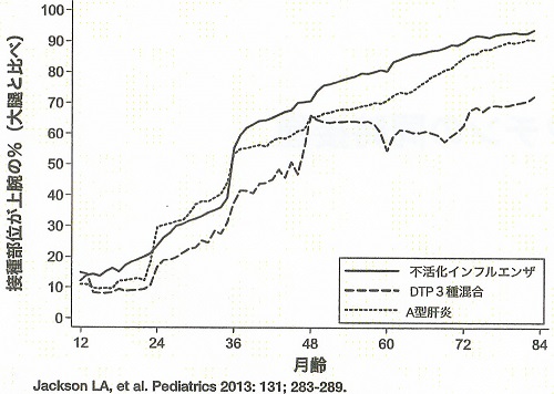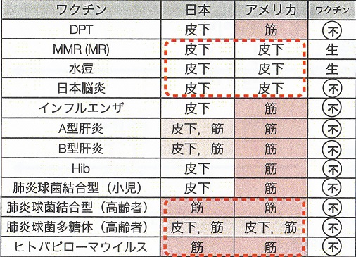 アメリカでのワクチンの接種部位を見てみると、3歳児以降に上腕に接種する頻度が増えている。