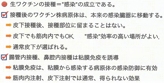 したがって、接種後ウイルスが生成し、本来の感染臓器に移動するため、非下でも筋肉内でも接種は良いが、感染効率の高い場所が良いため、通常は皮下が選ばれる。