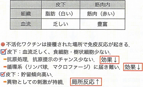 皮下は血流が乏しく、食細胞や樹状細胞は少なく、リンパ球やマクロファージが届きにくいため、抗原処理効率が悪く免疫反応効率は悪いが、貯留傾向があるため、異物としての刺激が持続するため、局所反応が強く出やすい。