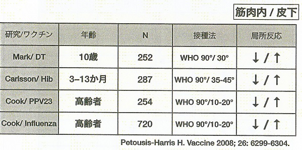 幾つかの報告があるがいずれも、筋肉内接種に比べ皮下接種の方で局所反応が強い。