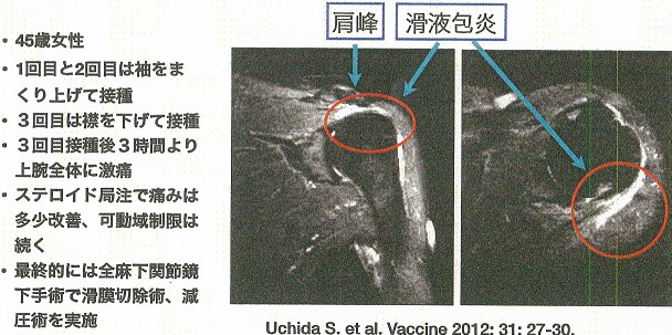 HPVワクチン接種の3回目に肩峰下関節包内に接種したために強い滑液胞炎を起こした症例報告がある。