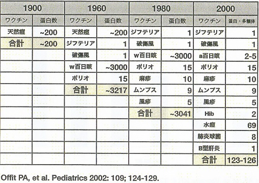 最近100年間のワクチンに含まれる抗原蛋白と多糖体の数の一覧を下記に上げる。