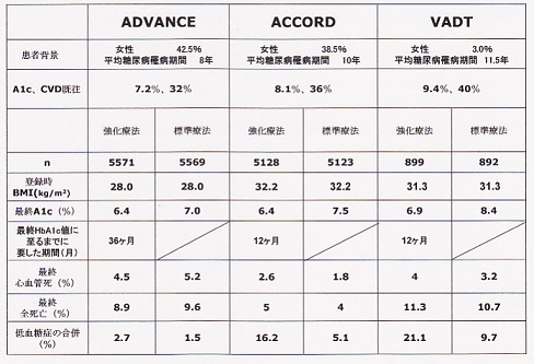 それでは、糖尿病の治療をしっかり行うと心筋梗塞になりにくくなるのかというと、ACORD研究やADVANCE研究、VADT研究結果を見てみても、血糖値の厳格な治療が心血管死亡を減らしてはいない。ACCORD試験においては強化治療群で死亡例が多く出たために、試験途中で中止となっている。
