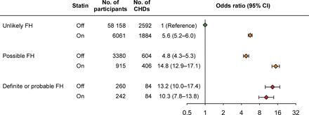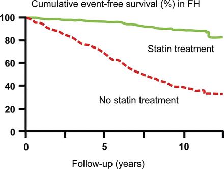 FHの患者で、スタチンの治療がされた群とスタチンの治療がされていない群の生存曲線は明らかに異なる。コレステロールを下げるためにスタチンの投与の有用性は確立されている。