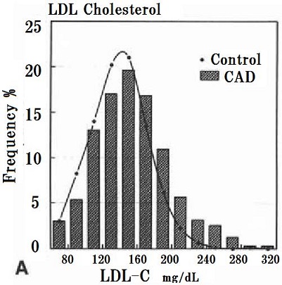 健常人と冠動脈疾患(CAD)患者でのLDLコレステロール値とHDLコレステロール値の分布を比較してみると、LDLコレステロール値は、ほぼ同じ分布を示す。