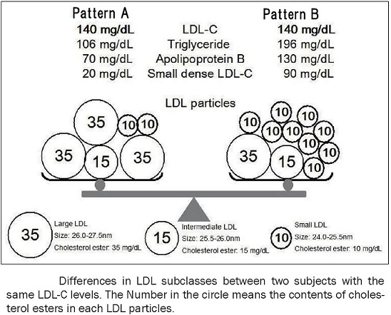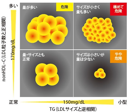 LDLの粒子径を4分割して心筋梗塞の危険度を検討した多くの研究では、LDL粒子径が小さいものほど危険度が高いことが示されている。