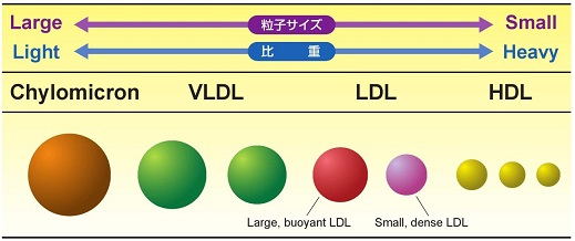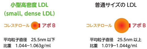 通常サイズのLDL粒子と小型高密度LDL(small dense LDL)粒子の特徴を下図に示す。