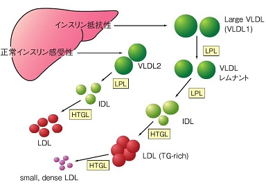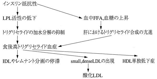 インスリン抵抗性があるとLPL活性が低下し、TGの加水分解が抑制され、血中TGの上昇を来す。それとは別の機序で、インスリン抵抗性があると、血中の遊離脂肪酸:FFAや血糖値が上昇し、肝臓におけるTGの合成が亢進することにより血中のTGが上昇する。その結果、IDLやレムナント分画の停滞,Small dense LDLの出現,HDLの低下が生じる。