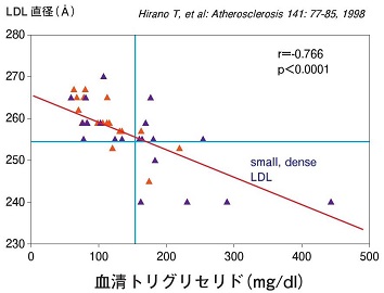 Small dense LDLを直接測定する方法が今まではなかったのでその指標として用いられていたのが、中性脂肪の濃度である。中性脂肪濃度が高いとLDL粒子径が小さくなることが示され、計算上LDL粒子径の説明変数の50%を中性脂肪濃度が示していることになる。
