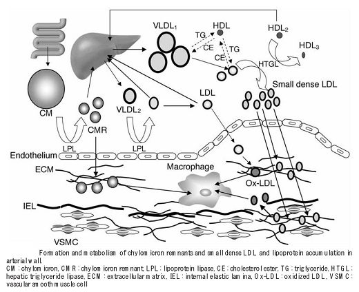 血液中に、疎水性の脂質は、粒子の表面にアポ蛋白を伴いリン脂質膜につつまれたリポ蛋白の構造で存在する。粒子径が大きいほど、軽く比重が小さく、成分としてはトリグリセリドを多く含んでいる。血管内皮に存在するlipoprotein lipaseにより代謝されながら小さな刑の粒子となり徐々に小さな比重の重い粒子となっていく。