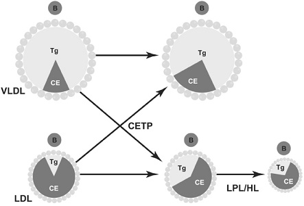 Small dense LDL粒子の所だけを取り出してみると、二つの段階がある。最初の段階はCETPによりCEとTGの受け渡しである。次いで、LPLやHLによるTGの分解である。