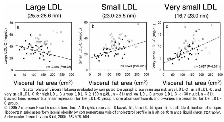 内臓脂肪と蓄積とLDL粒子のサイズを見てみると、Large LDLは内臓脂肪が増えると減少するが、Small LDLやVery Small LDLは著明に増加していることが示された。