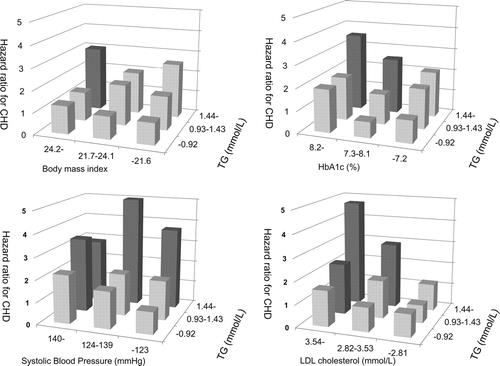 日本人940人の二型糖尿病患者の冠血管疾患のない患者さんを7.86年経過観察した際の、虚血性心疾患の危険因子は、LDLコレステロールの上昇とTGの上昇が独立した危険因子であり、その両者の異常がよりリスクを上昇させることが示されている。