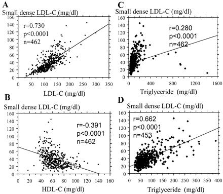 Small dense LDL濃度は、LDLコレステロールの他に、著しい高TG血症を除くTG濃度と正の相関を、HDLコレステロールとは負の相関を認める。