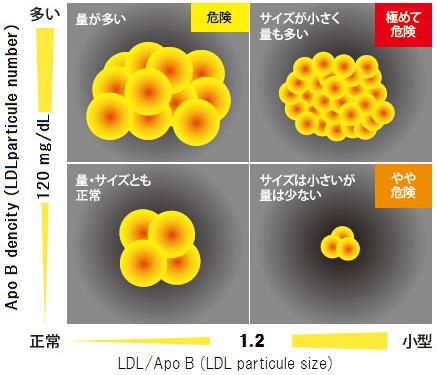 LDL粒子径が25.5nm以下のものがSmall Dense LDLであるが、それに該当する一般的な検査で目安となるものとしては、LDL/Apo Bの数値1.2が該当する。