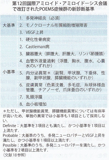 1956年、Crowらにより末梢神経炎、皮膚色素沈着及び形質細胞腫を伴う2例が報告され、POEMS症候群と呼ばれるようになった。発症年齢は、50~60歳で骨髄腫より約10歳若く、アジアでの発症頻度が高い。血管内皮細胞増殖因子VEGFの上昇が目立ち、血管透過性亢進、血管新生作用により、浮腫、胸腹水、皮膚症状が認められ、IL-1β、TNFα、IL-6などのサイトカンにより神経障害や内分泌異常などの病態が進行する。多発神経炎、モノクローナル形質細胞増殖障害、VEGF上昇の3台症状を認め、かつ硬化性骨病変、Castleman病、臓器腫大のうち一つ以上を認め、他の疾患が否定された場合に確定診断される。