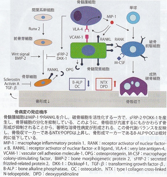多発性骨髄腫においては、骨髄腫細胞が産生するmacrophage infoammatory protein-1(MIP-1)の作用により破骨前駆細胞の形成が促進される。また、MIP-1は骨髄腫細胞の接着分子であるvery late antigen-4(VLA-4)を活性化し、骨髄間質細胞のvasculat cell adhesion molecule-1(VCAM-1)との接着が高まることによりreceptor activator of nuclear factor-κB Ligand(RANKL)の発現亢進やosteoprotegerin(OPG)の産生抑制が引き起こされ成熟破骨細胞が過剰に誘導される。一方、骨髄腫細胞はsecreted frizzled-related protein-2(sFRP-2)やDickkopf-1などの骨芽細胞阻害因子を産生することにより、骨芽細胞の分化を抑制している。さらに、骨吸収に伴い、骨から放出されたtransforming growth factor-β(TGF-β)やactivin A、sclerostinなどの因子は、骨の石灰化を抑制し、骨形成を阻害する。