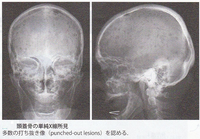 診断時には約80%において骨病変が認められ、脊椎骨65%、肋骨45%、頭蓋骨40%、肩甲骨40%、骨盤30%の頻度で認められる。